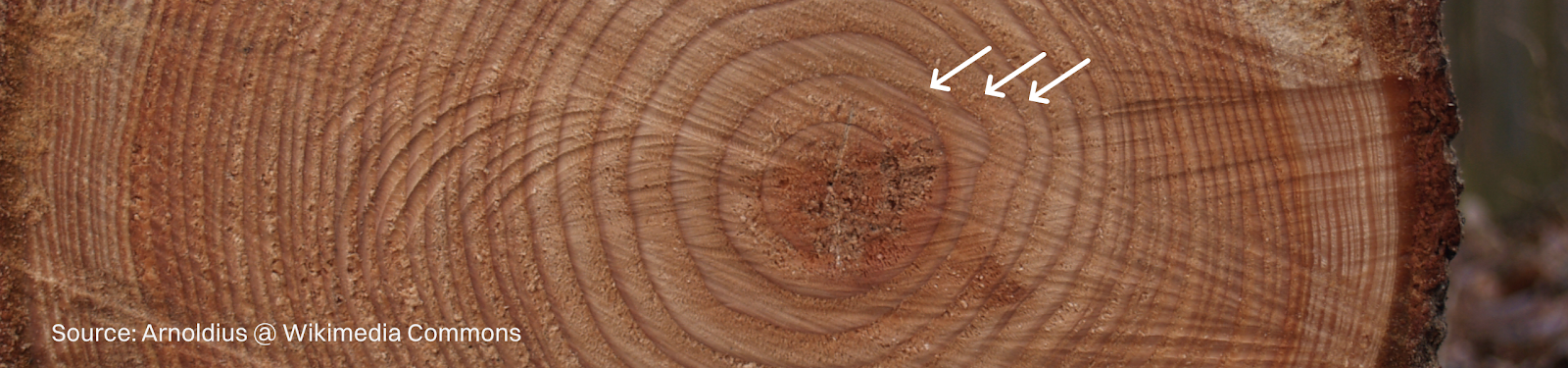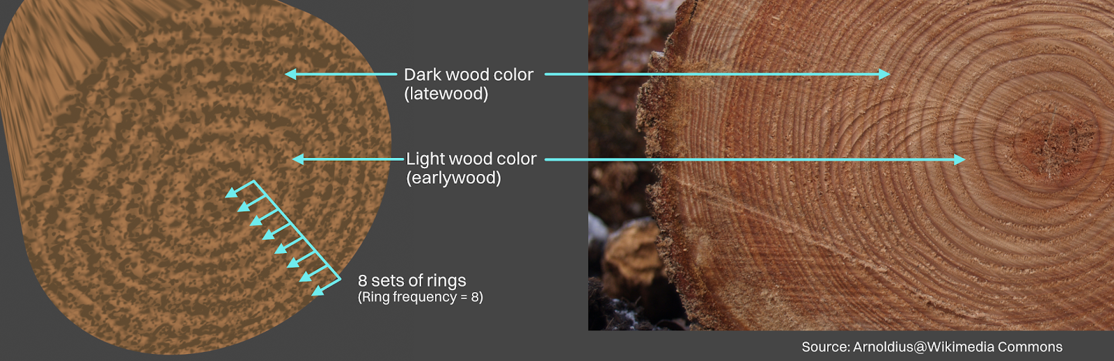 If we were to cut a tree down and look at the cross-section, it would appear to us as a series of wavy nested rings. Rings are usually annual (one light/dark ring set per year) and different trees grow at different rates in different conditions.