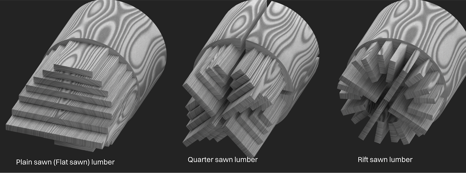 Flat-sawing wood is the cheapest and easiest way to process a log, and has the least wastage. It’s basically like putting it through a giant bread slicer and then squaring off the edges. It has the most variation in the grain pattern on the flat side of the board, but since it’s shearing the medullary rays at odd angles, they’ll tend to be less apparent.