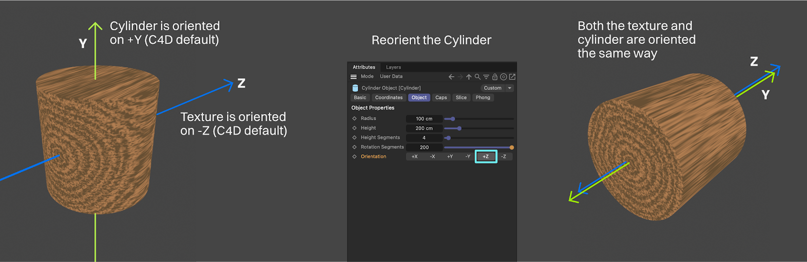 In both Standalone and C4D, as well as probably most DCCs out there, a default cylinder is oriented upright like a soda can. In both the apps we’re using here, that means the long side goes along the Y axis. In Blender as well as a few other Z-up apps, it means the long side is along Z.