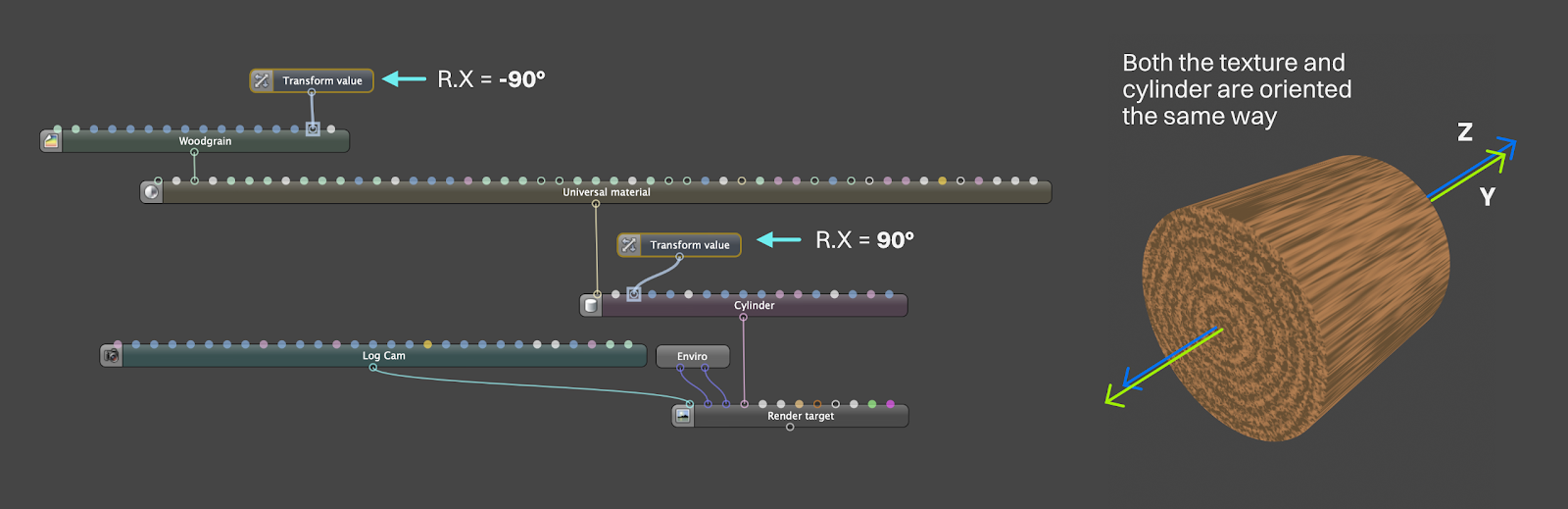 If we plug a default Woodgrain node into the Albedo channel of our material and put that on our log, we’ll see something weird. The rings are on the side, which is definitely not how wood works. Why?