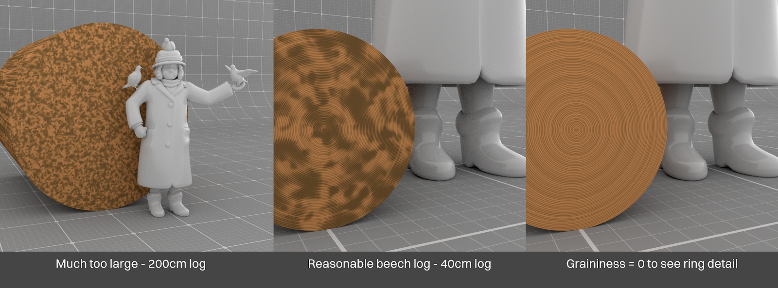 If we ask Claude what the dimensions of medullary rays for birch are, it’ll say something like 200-600 micrometers from the center of the tree outward, 15-40 micrometers thick, and 40-80 micrometers wide, which seems plausible. The issue is that we don’t have a good baseline for how large Perlin noise bits are, and even if we did, they’re being stretched and distorted already because of the cylindrical projection.