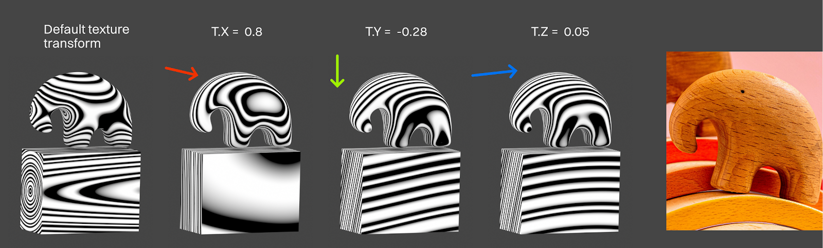 At this point, we can go back to our elephant and wood block. If we were using a DCC like C4D that let us reorient the cylinder, then we’ll notice the pattern is going the wrong way on our elephant/block geometry. To fix this, we just need to rotate the projection itself 90° on S.X.