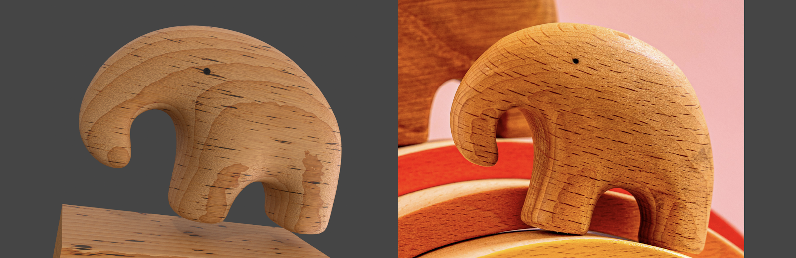 We’ll want a test model. Usually materials and shaders are developed on shader balls, but we have a specific target in mind for this - a wooden elephant toy that’s similar to the one in the reference photo. Working with 3D projection is tricky though, so we also have a cube about the size of the elephant in the scene so we can see what’s happening more clearly.