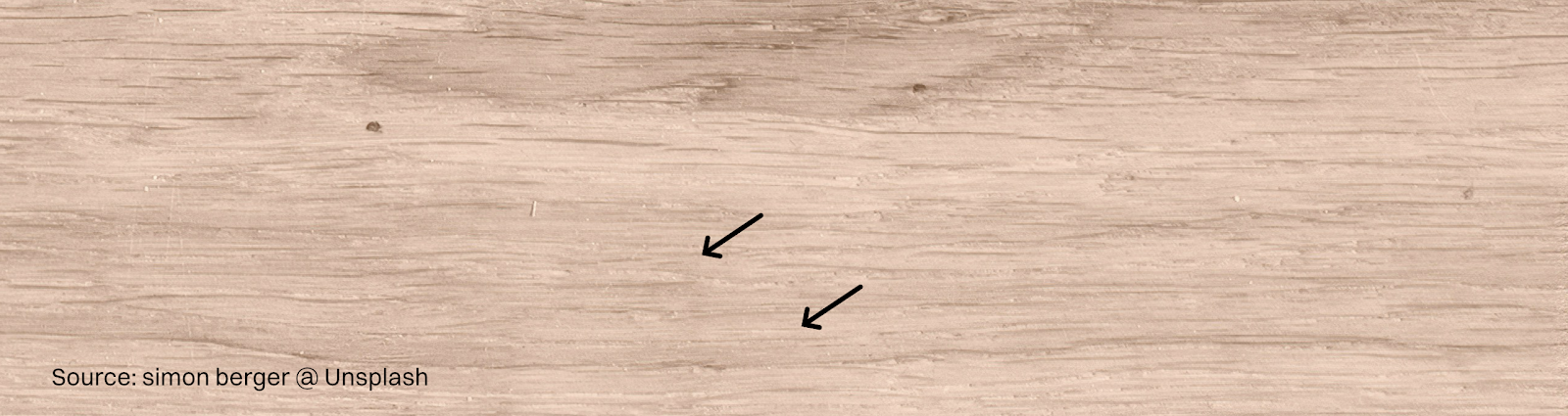 If we look really closely through a magnifying glass at the end where it was cut (don’t do this if you’re a trypophobe), we’d see small holes throughout the wood - these are technically called vessel elements, but they’re commonly referred to as pores. These pores are tall hollow tubes like straws that grow in the same direction as the fibers and transport water and nutrients up the tree from the roots. Depending on the wood, these pores are more or less apparent. Typically in a hardwood like the beech we’re going to be making they’re nearly invisible to the eye (just a few micrometers across), so we’re just going to lump them in with the fibers to make a “grainy” overlay for our material.