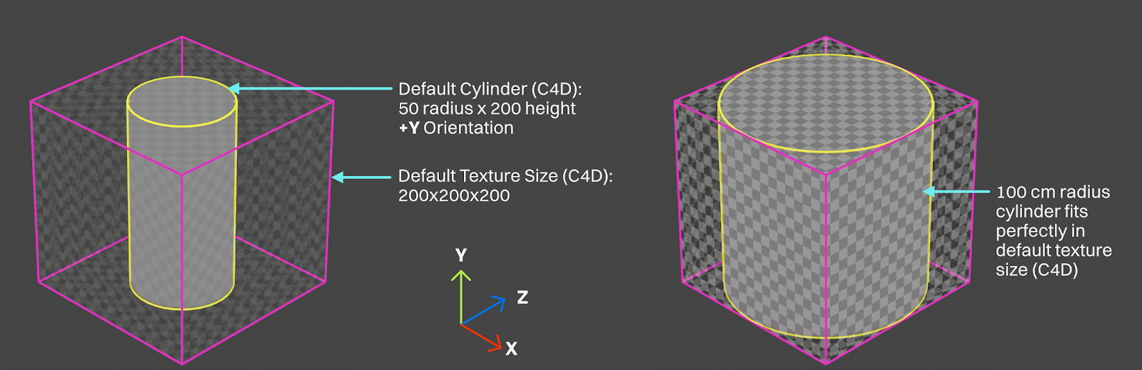 The default cylinder size in C4D is 50 cm radius x 200 cm tall. The texture size is 200 x 200 x 200 cm, so if we want to see one single default “tile” of it, we’ll want the radius to be 100 cm to give us a 200 cm diameter.
