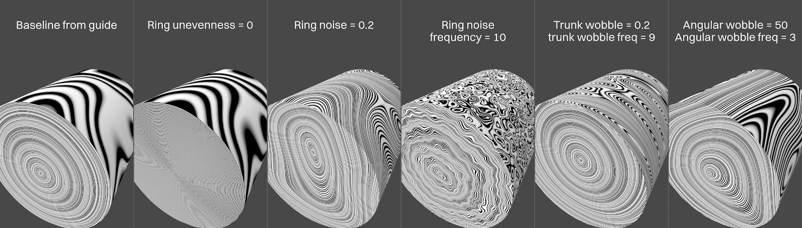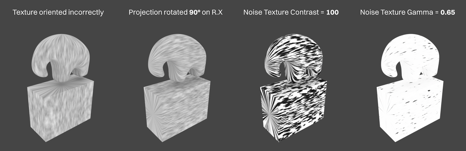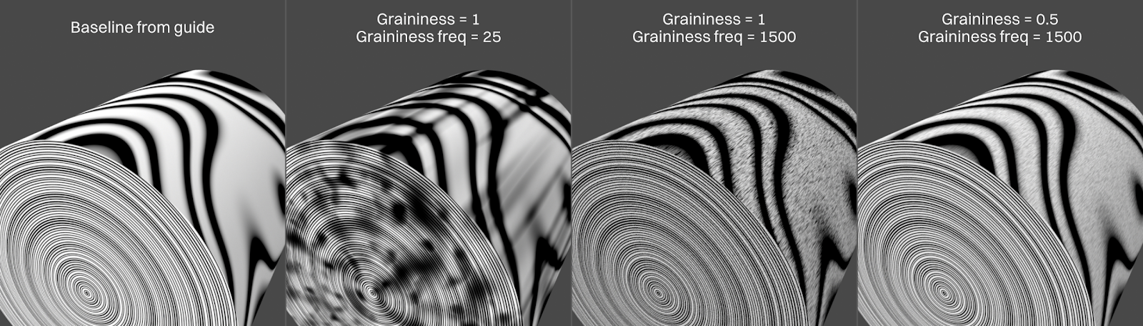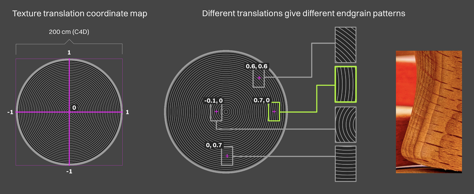 Grain is a series of parallel-ish strands, so we want XYZ to UVW projection again. Unlike the rings, we don’t need to worry about rotating the projection for the grain since we can just stretch it in the direction we need (Z in this case).
