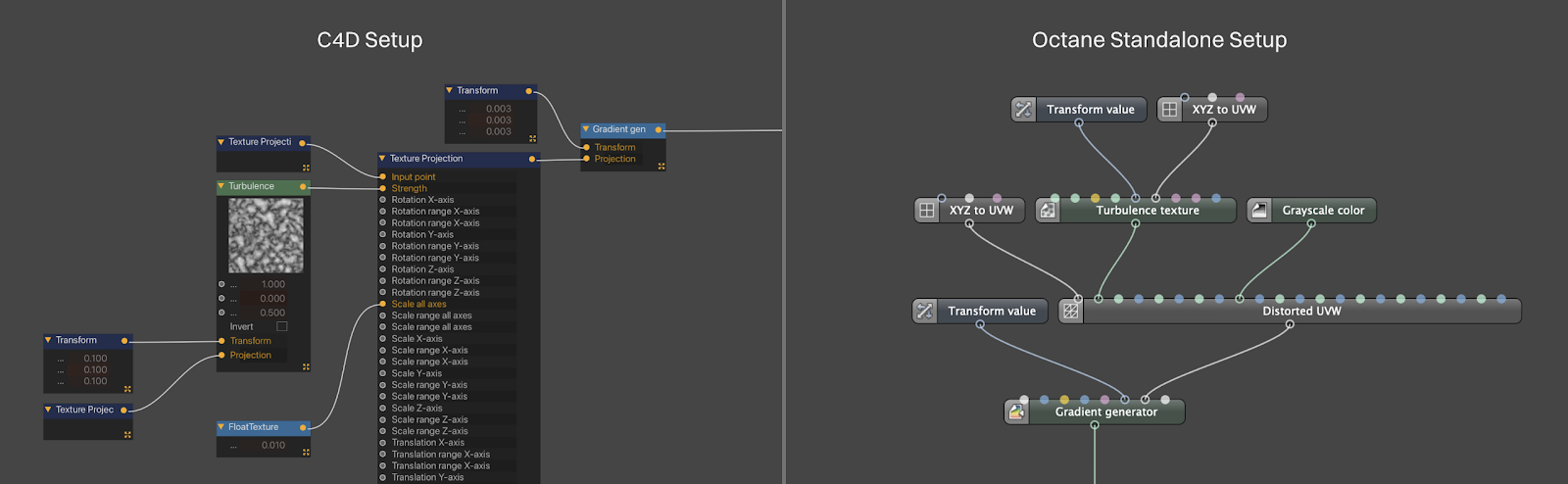 We can either transform the projection itself or the texture here and get the same results. Let’s transform the texture by adding a Transform (values) node into the Noise texture.