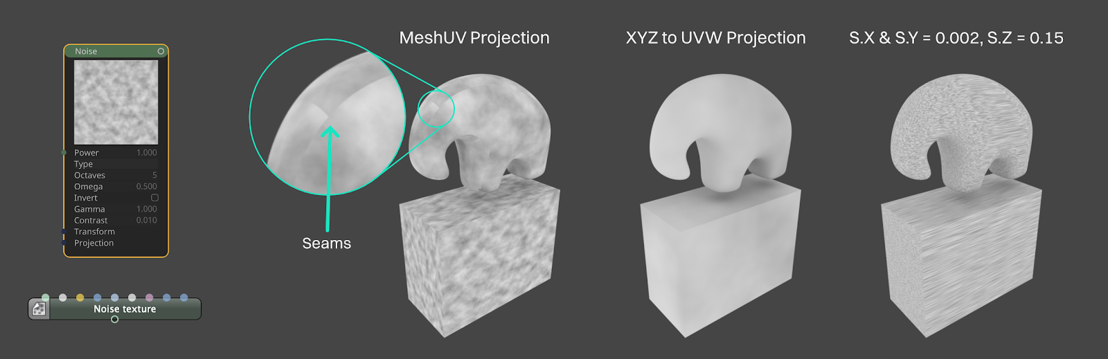 Standalone defaults XYZ to UVW projection, but it’s always a good idea to add an external projection node anyway to get more control and make sure we’re operating in Object Space instead of World Space (different textures have different defaults).