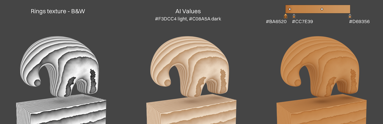 From here it’s a matter of picking colors. We can either try to pick them from our source image, ask AI, or just guess (or some combo of those). There are no real-world values to fall back on here for this specific stained wood, and any number of other factors like lighting, material properties, reflections, post processing, etc can alter the colors in the source photograph.