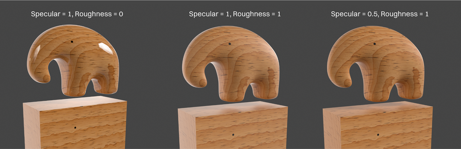 In order to see what roughness will do, we need some specular contribution. Let’s set Specular to 1. Wood is pretty matte, so the Roughness should go all the way to 1. This particular finish isn’t very reflective, so we can reduce the Specular down to 0.5 to cut the glare and adjust later if needed.