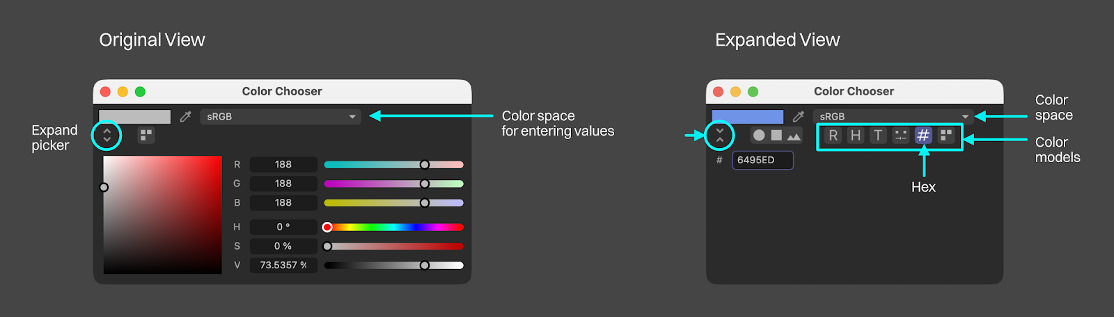 This shows us another chip that has our color on it, an eyedropper, and a color space dropdown which we’ll look at in a sec. Below it are two models: 8-bit RGB and HSV. There’s also a button for saved swatches, and one that expands out the picker to show us other models - this is where the hex model will be.