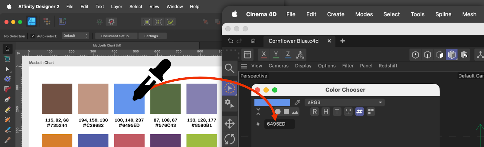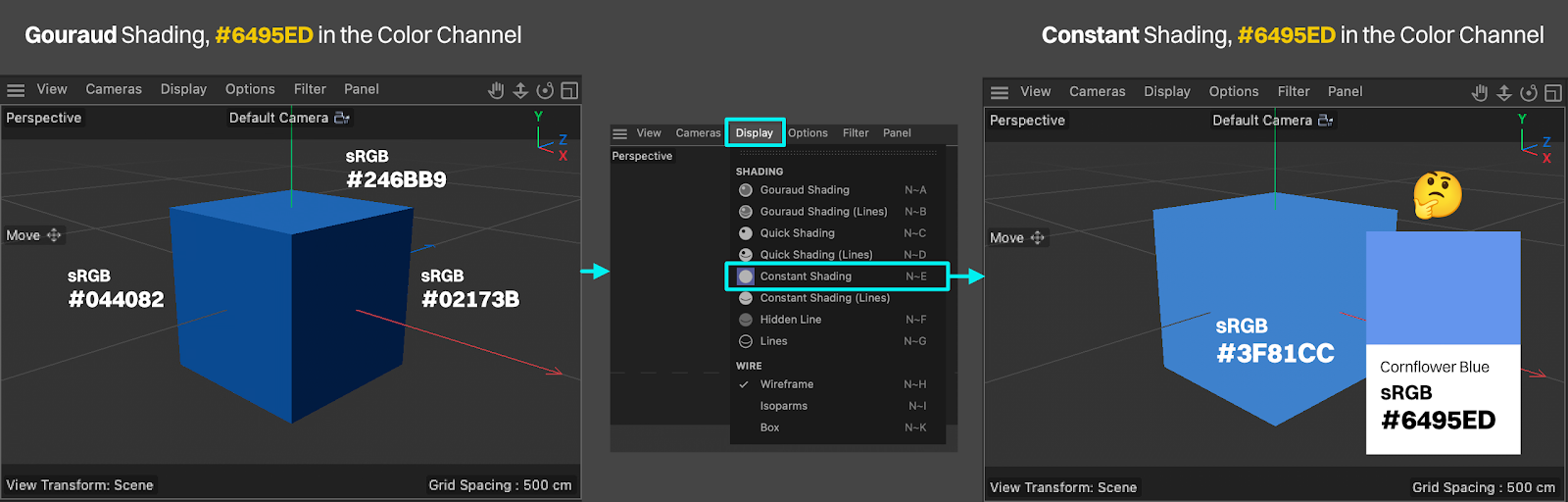 In the C4D perspective viewport, we see three different blues, none of which are Cornflower Blue. That’s to be expected though, the default shading in the viewport (Gouraud) does a quick simulation of what the light and shadow would look like in the scene to help us visualize it better. This is what we’re usually after in 3D - variation in values means things look 3D to us.