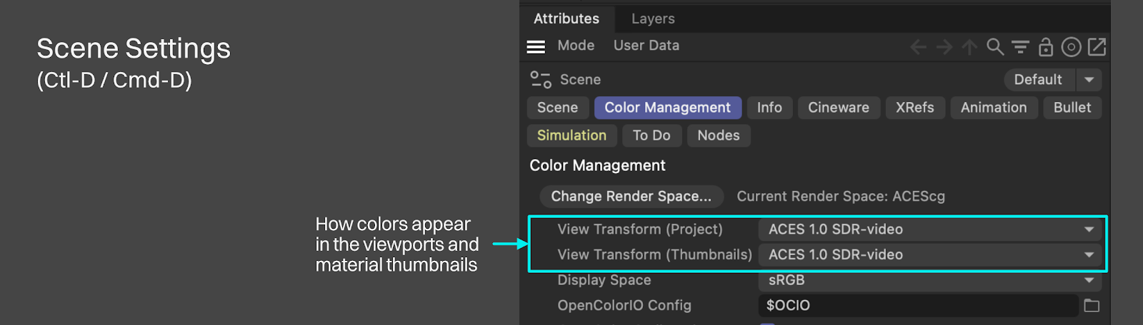 Important:This isn’t actually changing any of our color values themselves, it’s just displaying them according to the processing scheme selected. Being an ACES shop, Maxon decided that an ACES transform was a good default for this, and it should better match the final render if ACES tone mapping is being used.