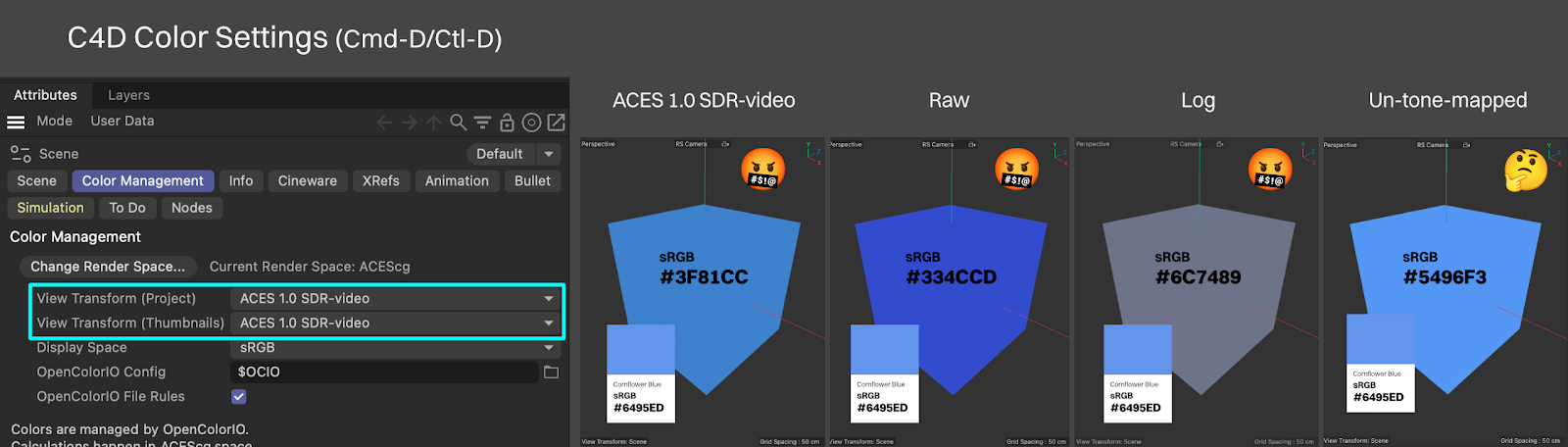 At this point, Cornflower Blue should look correct everywhere we see it in the Cinema 4D environment, regardless of whether the Render Space is set to ACEScg (default), scene-linear rec.709-sRGB, or Legacy.