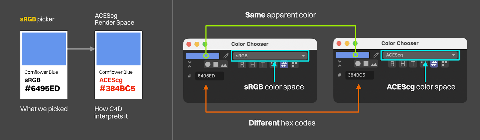 What’s happening here is that our sRGB #6495ED was converted to ACEScg, which is fine and didn’t disrupt anything, but now that C4D needs to actually display the value somewhere, it has to be converted back to sRGB since that’s what our monitors are expecting.
