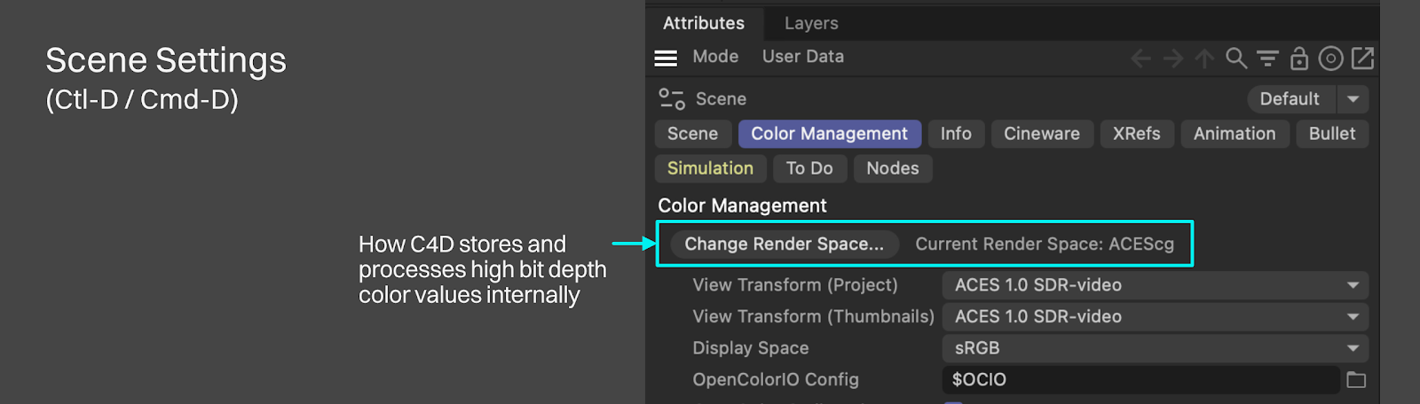 Cinema 4D - and its currently selected render engine - needs to be operating in a working color space. This is where all the super precise render calculations happen, so it needs to be a large and linear-encoded to work well with physically-accurate values. A proper working environment so we can be a functional part of polite render society!