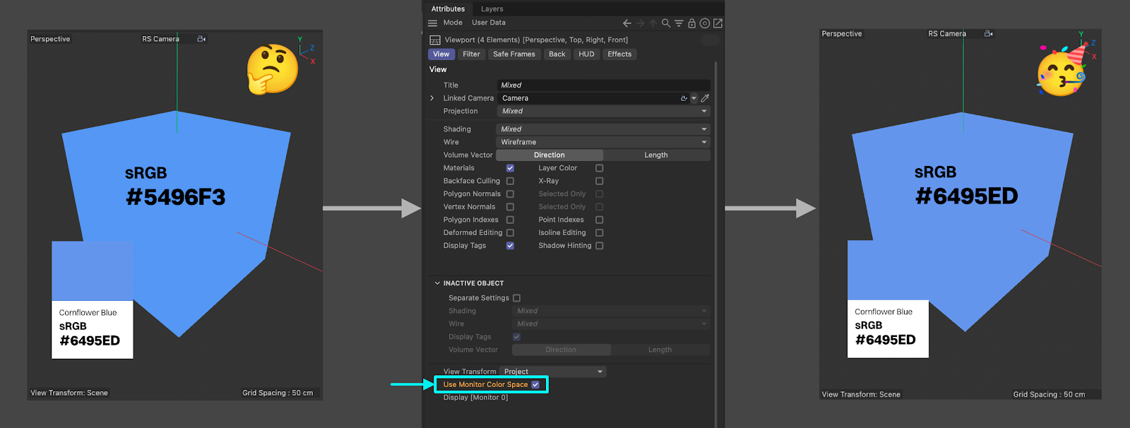 At the very bottom of the View tab is an option for Use Monitor Color Space, which is off by default (why, Maxon, why.) When we turn this on, C4D will run the colors through one last conversion, and our beloved Cornflower Blue color will FINALLY appear as #6495ED in the C4D viewports.